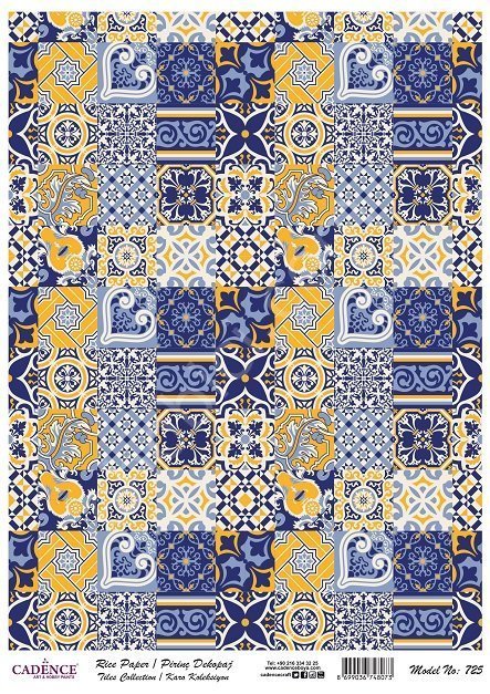 29x42cm (A3) Ebatındadır. Pirinç kağıt dekopajlar çeltik sapından yapılan ince kâğıt üzerine basılı olup, dekopaj çalışmaları için kullanımı kolay, ince ve dirençli her türlü yüzeyde Cadence Dekopaj Plus ile keyifle kullanılabilir. En iyi sonuç için zemin renginin beyaz olması tavsiye edilir. Tasarımlar Cadence Craft için özel hazırlanmıştır.