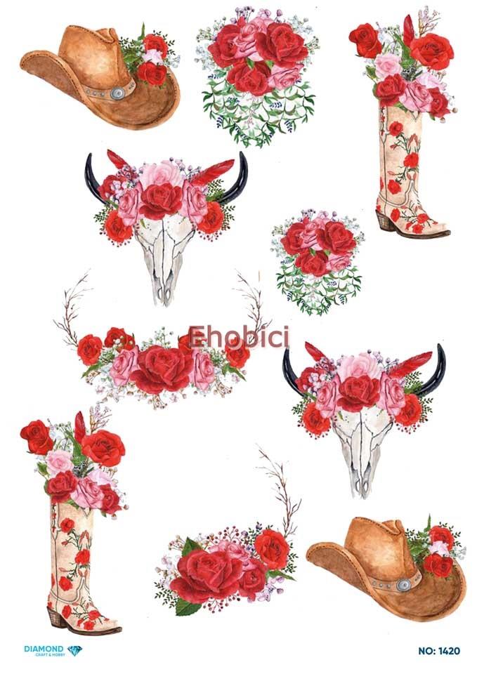 Diamond Craft Pirinç Dekopaj Modelleri, 30x42cm (A3) Ebatındadır. Pirinç kağıt dekopajlar çeltik sapından yapılan ince kâğıt üzerine basılı olup, dekopaj çalışmaları için kullanımı kolay, ince ve dirençli her türlü yüzeyde Cadence Dekopaj Plus ve Transfer Dekopaj Tutkalı ile keyifle kullanılabilir. En iyi sonuç için zemin renginin açık renk olması tavsiye edilir.